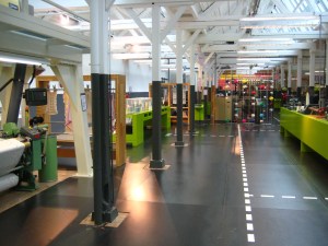Enigszins daas dwaalde ik door de ruimte. Het was er bloedheet. De geur van warme stof (die bestaat echt) drong mijn neus in en steeg naar mijn hoofd. In een aangrenzende zaal stond een reusachtige stoommachine te draaien.