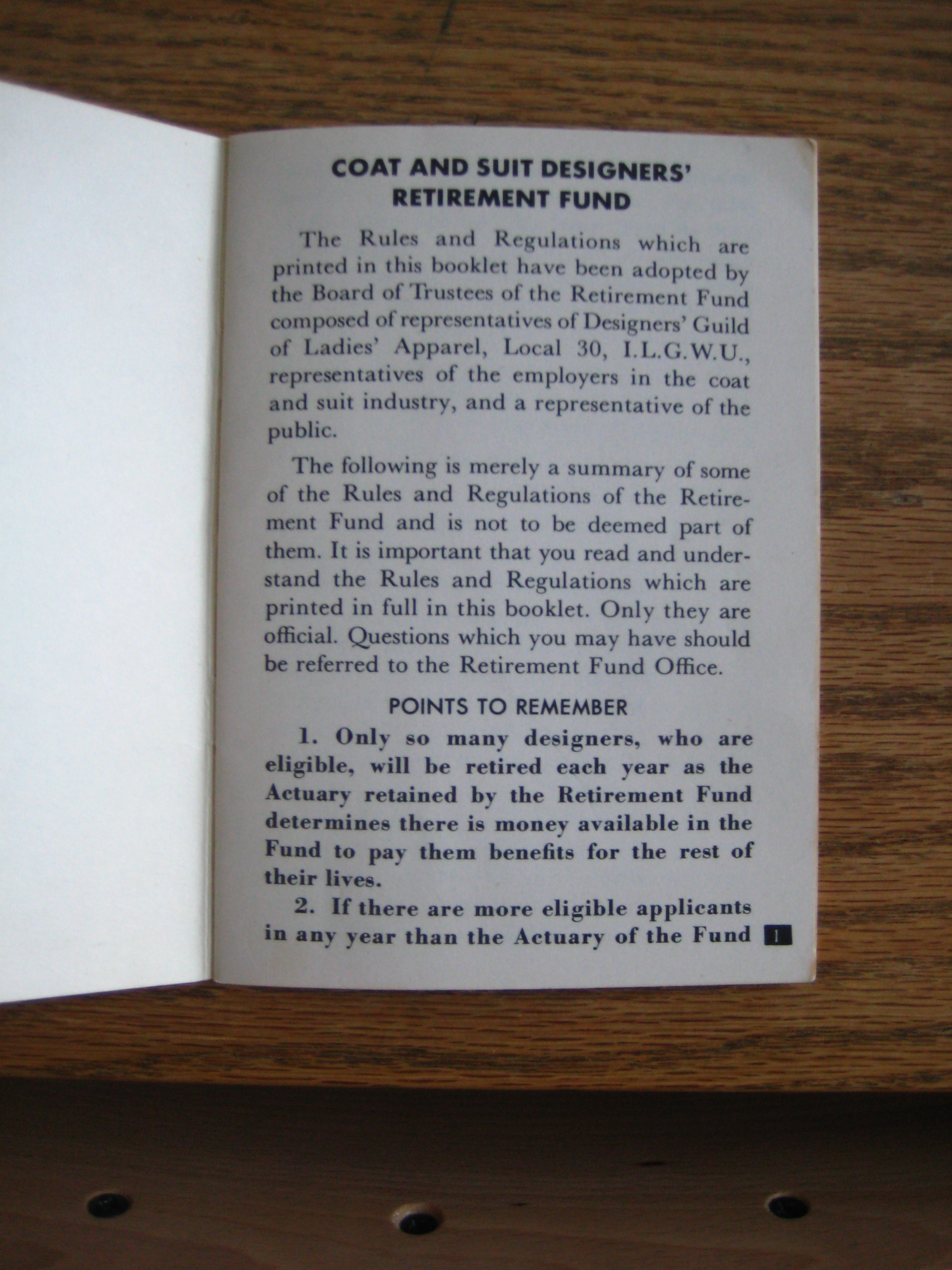 Ik blijf in het boekje bladeren, hoewel ik de inhoud niet lees. Het is bepaald geen page turner. De inhoud bestaat uit de Rules and Regulations of the Coat and Suit Designers’ Retirement Fund, zoals herzien en opgemaakt in 1957. Iedereen die destijds lid was van een kleermakersvakbond in New York, zoals de Designers’ Guild of Ladies’ Apparel, of de International Ladies’ Garment Workers’ Union (I.L.G.W.U.), had zich aan deze regels te houden, wilde hij – en in beginsel vooral zij – aan het eind van een lange carrière aanspraak maken op pensioengeld.