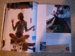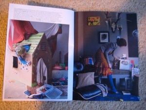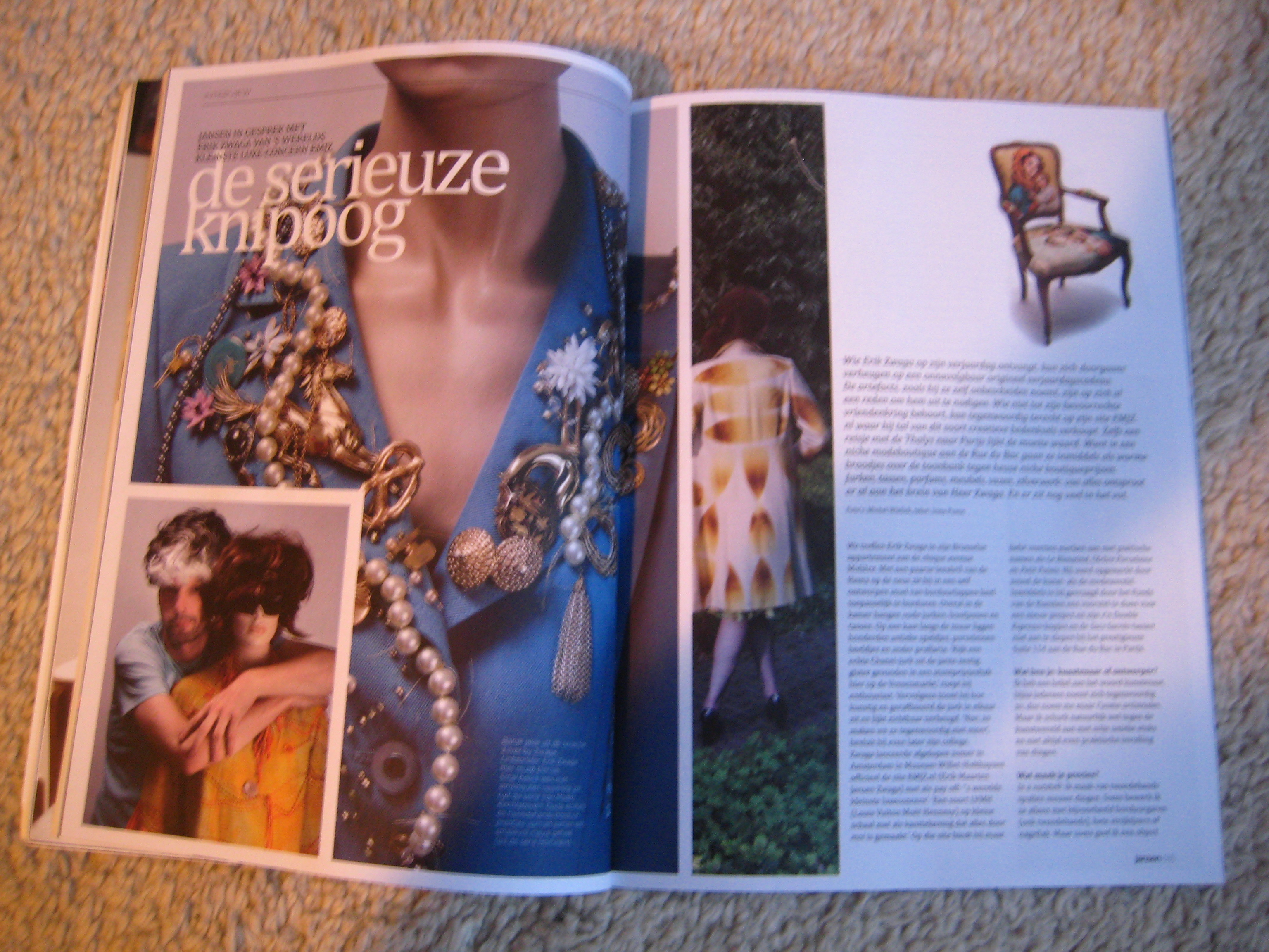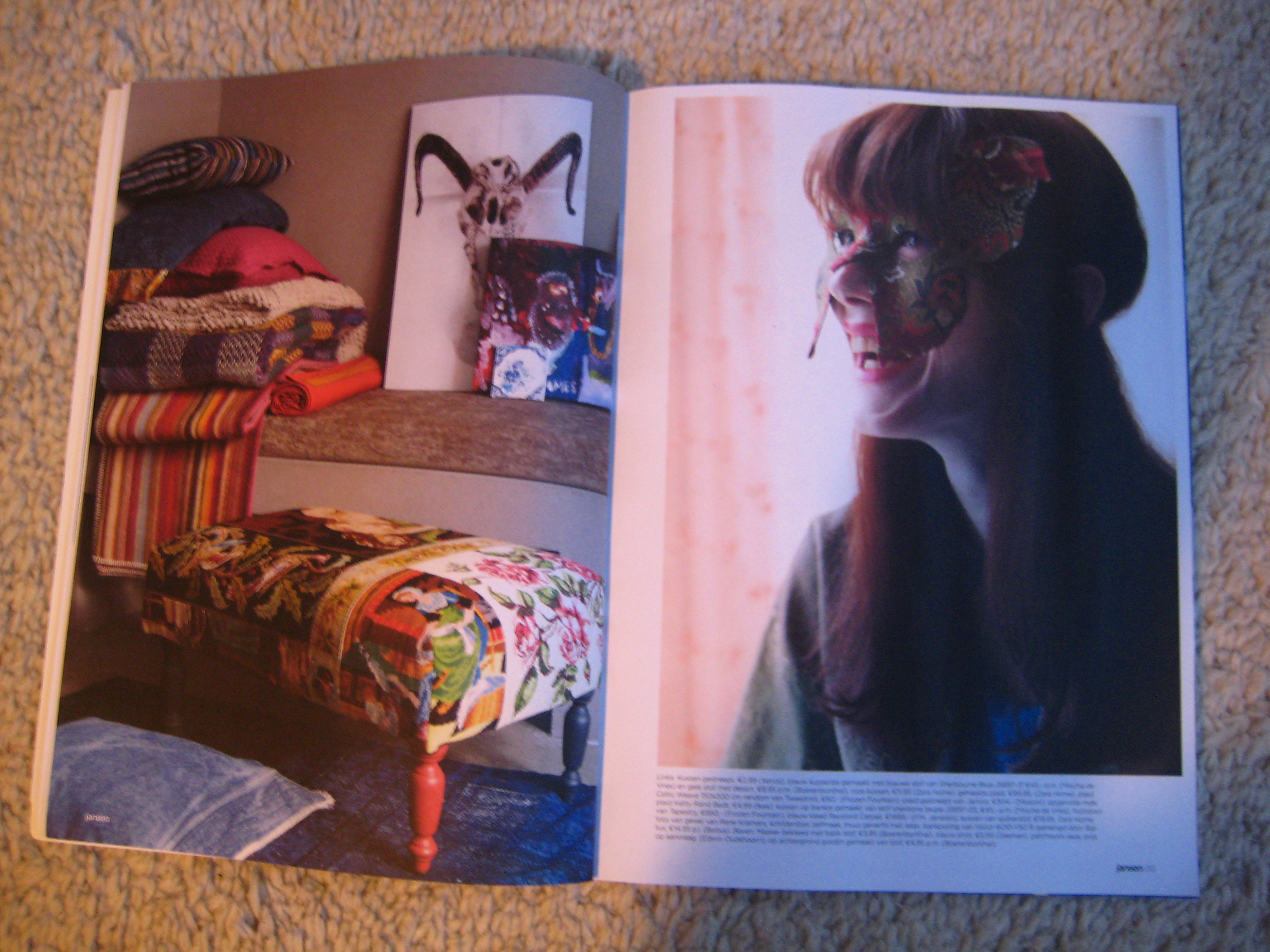 En ik vraag me al even lang af hoe het toch komt dat een tijdschrift dat nota bene gaat over smaak, het voor elkaar krijgt om zijn model te kleden in een bij elkaar gesnaaid ensemble van tweedehands noppenjurken, geruite jurkjes, gebloemde panty’s, paisley hoofddoeken, gecombineerd met bloemencorsages, batik maskers, rozenkettingen, Burberry-tassen en schortjes. En waarom ze poseert in een al even samengeraapt decor van boerenbontservies, spijkerstofkussens, Delftsblauwe tegeltjes, een Eames Lounge Chair en een met allerlei stoffen beklede poef. En waarom ze een wortel uit haar rieten mand heeft steken.