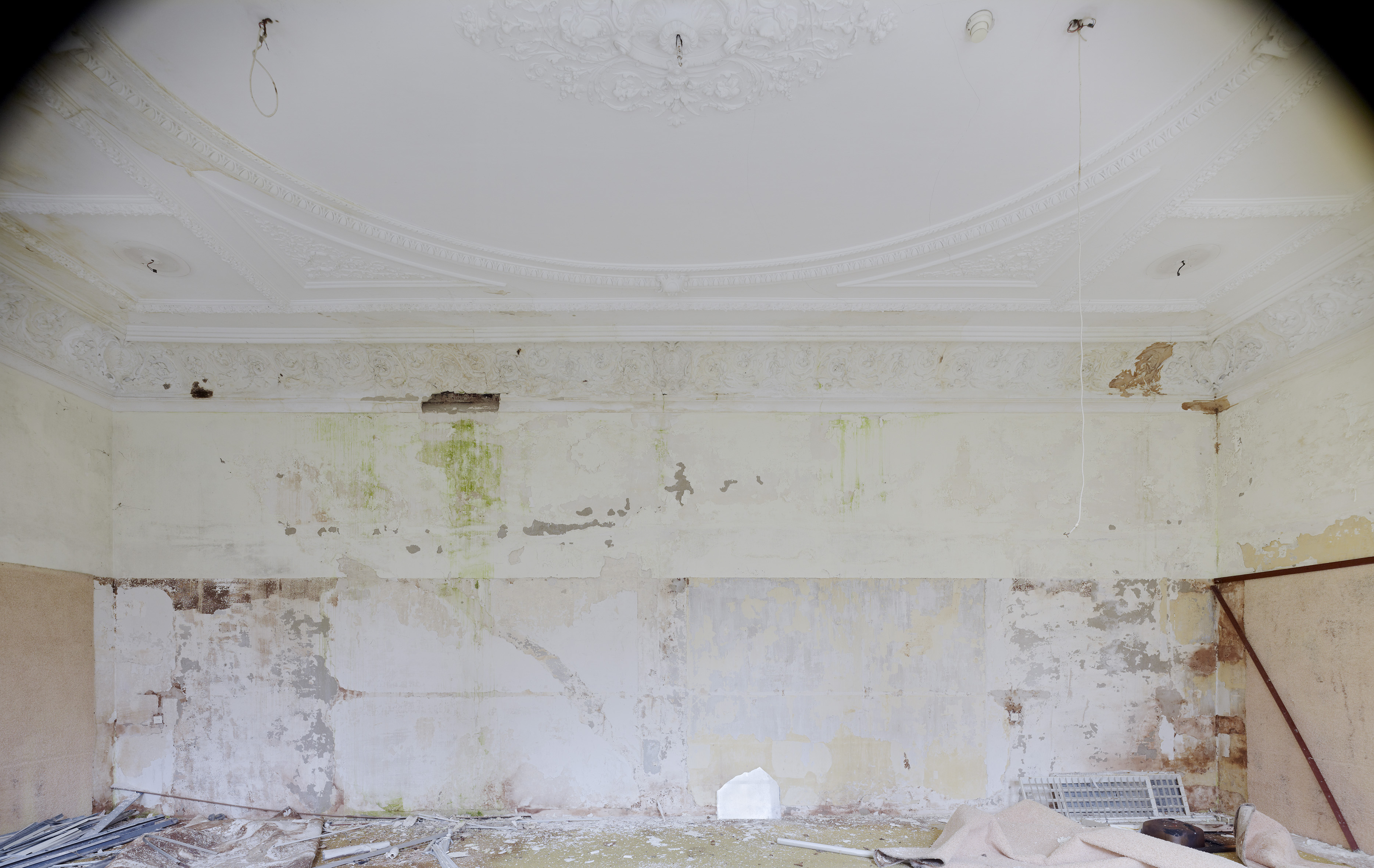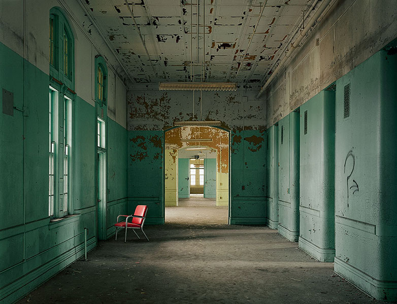 De ruimten die hij fotografeerde, zoals een half vergane zaal met een rijk geornamenteerd plafond of een hoek van een kamer met een donkere parketvloer waarin een gekke plek zit, zitten vol spanning. Deze foto’s zijn minder monumentaal en objectief dan hun Amerikaanse voorbeelden. Ze zijn donkerder en vanuit onverwachte hoeken genomen, alsof ze symbool staan voor de bochten en krochten van de menselijke geest. Het maakt deze foto’s minder documentair dan die van Payne, omdat ze niet alleen de architectonische overblijfselen tonen, maar ook de waanzin in het hoofd van een zieke proberen te vangen.