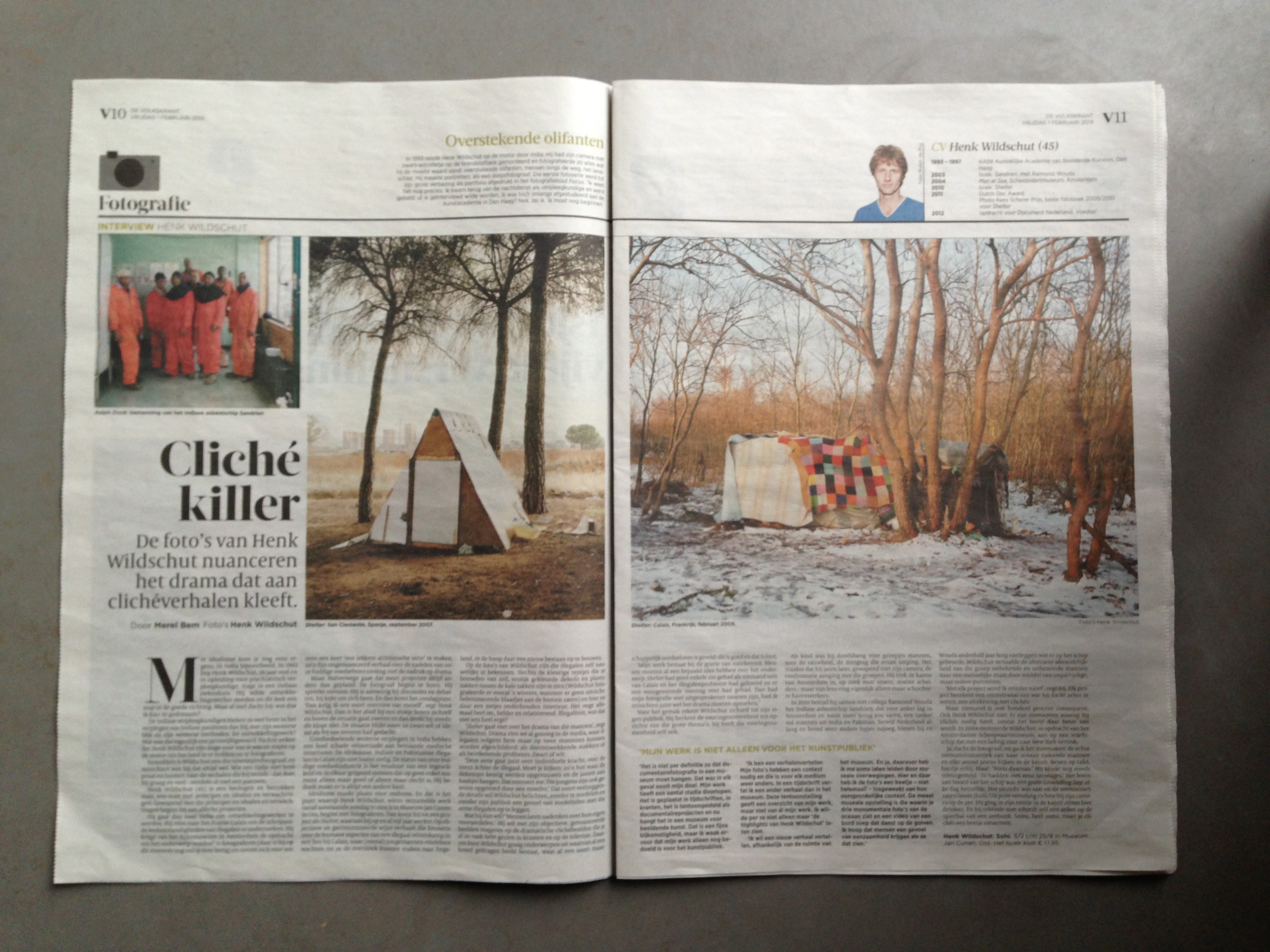 Op de foto’s van Wildschut zijn die illegalen zelf nauwelijks te bekennen. Slechts de kleurige tentjes die ze bouwden van zeil, vrolijk gekleurde dekens en plastic zakken tussen de kale takken zijn te zien (Wildschut fotografeerde er vooral ‘s winters, wanneer er geen uitzichtbelemmerende blaadjes aan de bomen zaten) en hier en daar een netjes onderhouden interieur. Het oogt allemaal heel sec, helder en relativerend. Illegaliteit – was dat niet iets heel ergs?