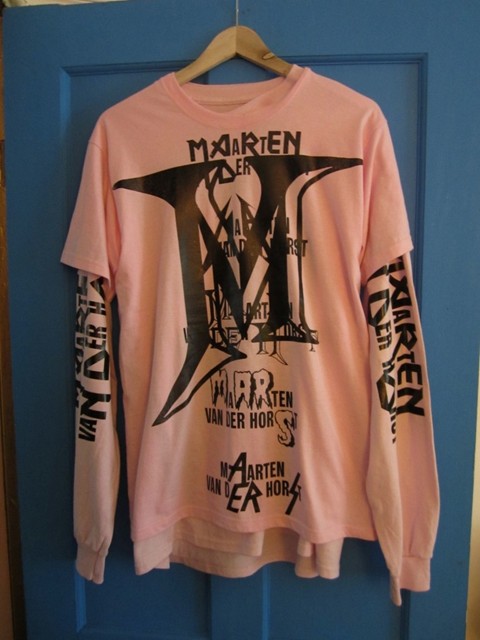 Hij speelt ermee, met dat gedweep. Hij maakte kleding uit plastic zakken van de plaatselijke supermarkt, ontwierp een logo met zijn eigen naam, knalgroot in de lettertypes van allerlei verschillende deathmetalbands. ‘Ik vind het leuk om mijn naam zo groot op een T-shirt te zien. Het slaat nergens op, want ik ben nog maar een jaar bezig. Het is blufferige zelfspot, ik vind dat humor. En het is zo leuk om dingen te ontwerpen waar je zelf eigenlijk keihard om moet giechelen, en dat anderen die dan kopen.’