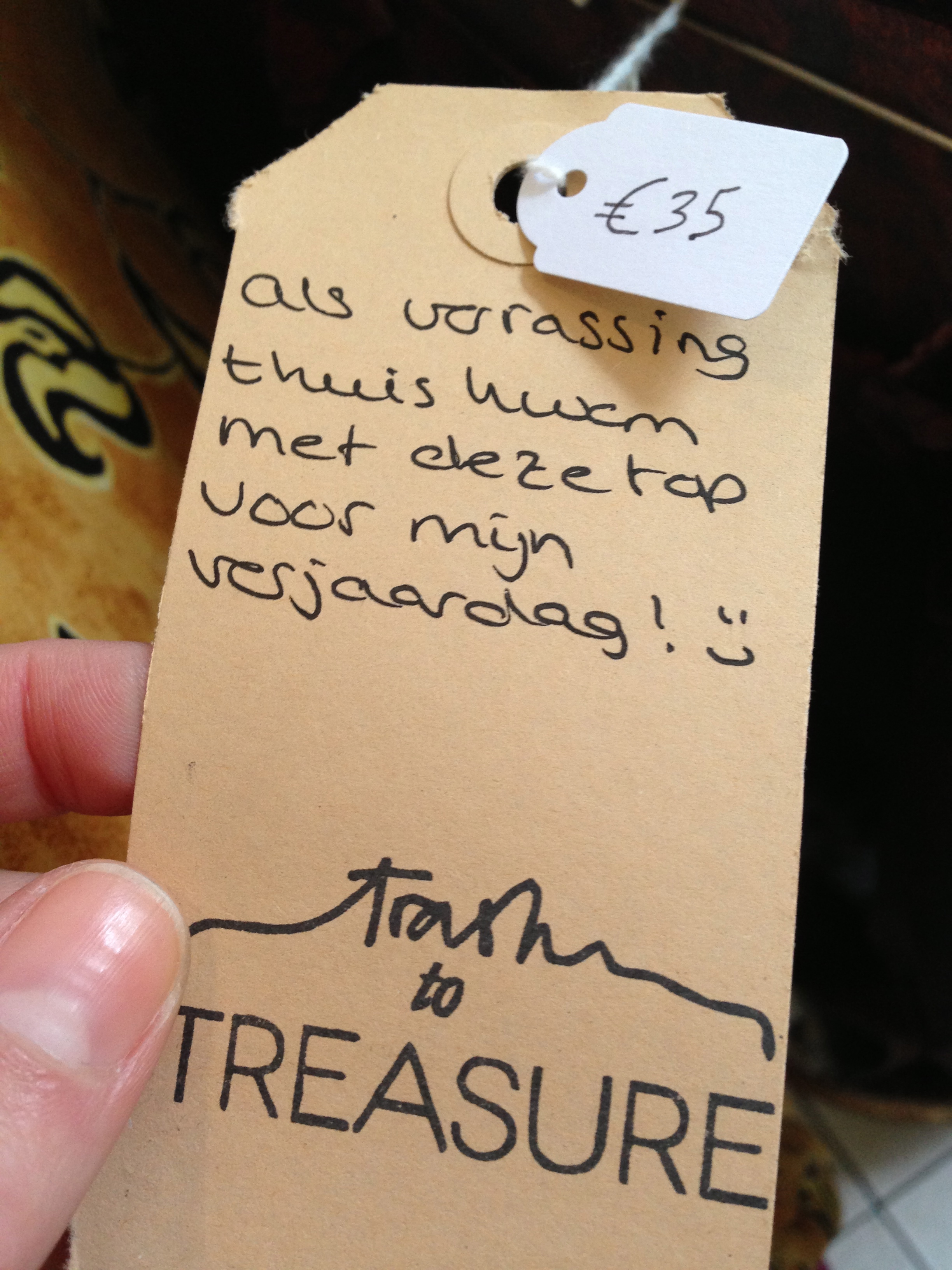 Trash to Treasure is een initiatief van Leanne Jacometti en Caroline van ’t Hoff, een net afgestudeerde econome en een modemarketingspecialiste. Het is een plek waar je terecht kunt voor tweedehands kleding en spullen én voor de verhalen erachter. Iedereen die hier zijn oude jurken en jassen komt brengen, mag niet weg voordat van elk stuk de geschiedenis op een label werd geschreven. Zodat degene die de spullen later koopt een extra laagje mee naar huis neemt.