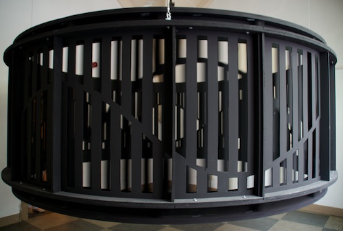 Het was op de eindexamenexpositie van de kunstacademie in Maastricht dat Stijn Huijts voor het eerst de draaiende lattentrommel (‘ronddraaiende lampenkap’, noemt Huijts het kunstwerk) van Chaim van Luit (27) zag en dat hij ‘aangenaam verrast’ was. Hier was iemand die iets ‘volstrekt eigenaardigs’ maakte met ‘minimale middelen’. Huijts, sinds een jaar directeur van het Bonnefantenmuseum in Maastricht, stond er een tijdje naar te kijken terwijl hij dacht: ‘Waar kíjk ik naar?’.