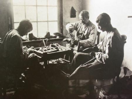 De Langstraat. Een drietal thuiswerkende, Waalwijkse schoenmakers aan het werk.