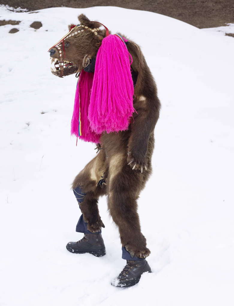Er staat een beer in het struikgewas. Hij laat zijn schouders hangen, en zijn kop ook. Je ziet meteen dat het geen echte beer is; het is een man verkleed als eeuwenoud heilig wezen, aangeroepen ter bescherming en voorspoed. Maar wat je niet kunt zien, is wie hier nu precies droevig is. Is deze mythische beer in de heidense verhalen die over hem worden verteld gewoon geen lachebekje of had de man in het berenpak zijn dag niet toen hij werd gefotografeerd?