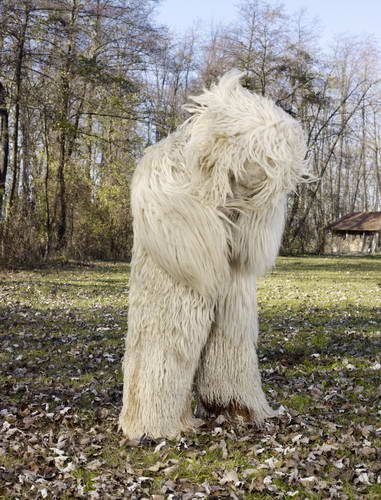 Soms gebeurt dat meteen. Dan zijn menselijke onderdelen (handen, gezichten, voeten) onzichtbaar achter dierenkoppen of doodshoofden en handschoenen met klauwen, en laat Fréger zijn modellen bovendien een beetje toneelspelen tegen de achtergrond van de meest geweldige landschappen. Staan ze in de sneeuw onhandig te vechten of met een zeis te zwaaien, of te verwaaien op de groene vlakte, zoals de Bulgaarse langharige Babugeri, die doen denken aan Chewbacca uit Star Wars, maar dan zonder gezicht. Het resultaat is hilarisch en roerend tegelijk; alsof menselijke monsters die niet goed raad weten met zichzelf, auditie doen voor een rol in een film.