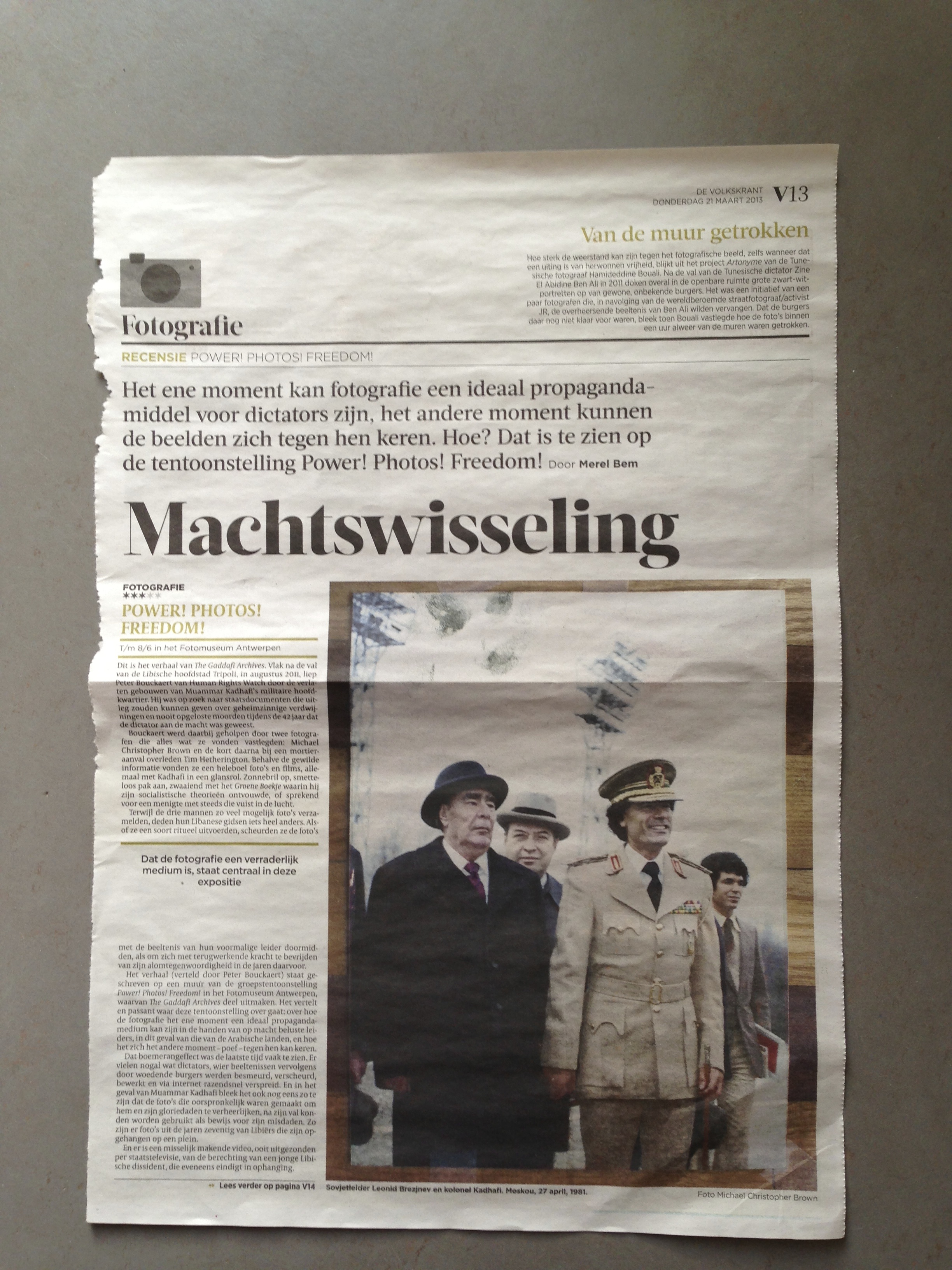 Het verhaal (verteld door Peter Bouckaert) staat geschreven op een muur van de groepstentoonstelling Power! Photos! Freedom! in het Fotomuseum Antwerpen, waar The Gaddafi Archives deel van uitmaken. Het vertelt en passant waar deze tentoonstelling over gaat: over hoe de fotografie het ene moment een ideaal propagandamedium kan zijn in de handen van op macht beluste leiders, in dit geval van die van de Arabische landen, en hoe het zich het andere moment – poef – tegen hen kan keren.