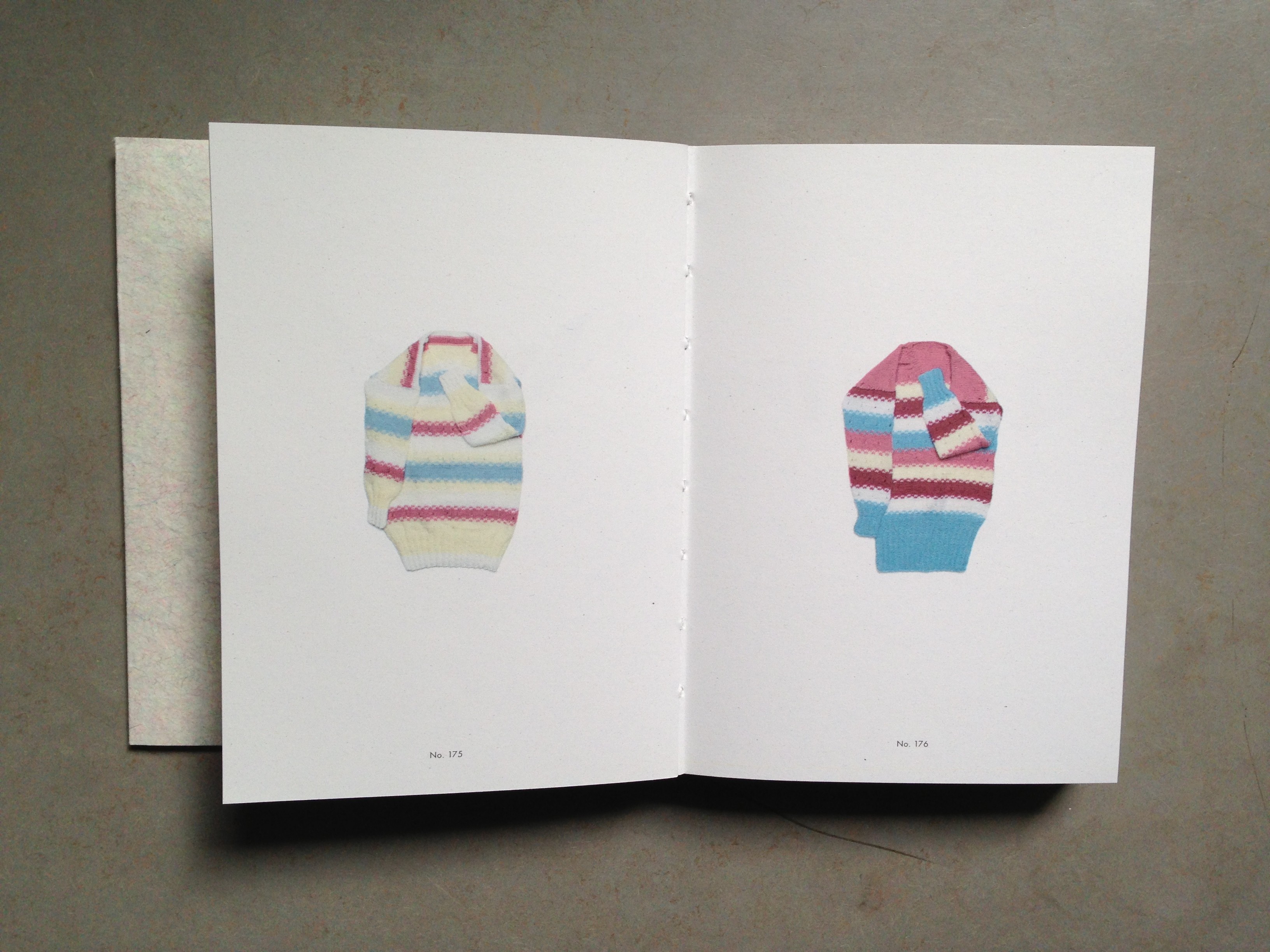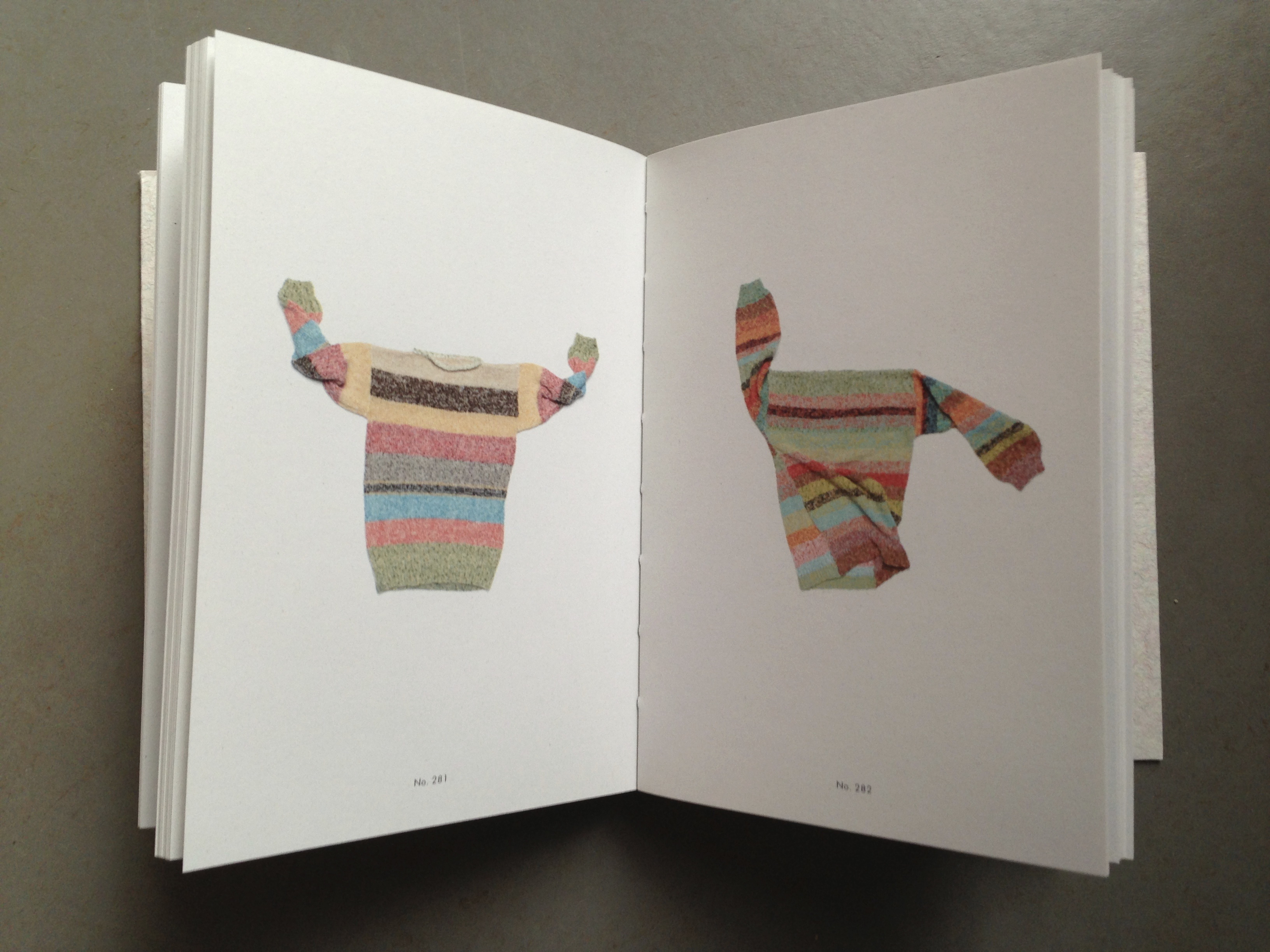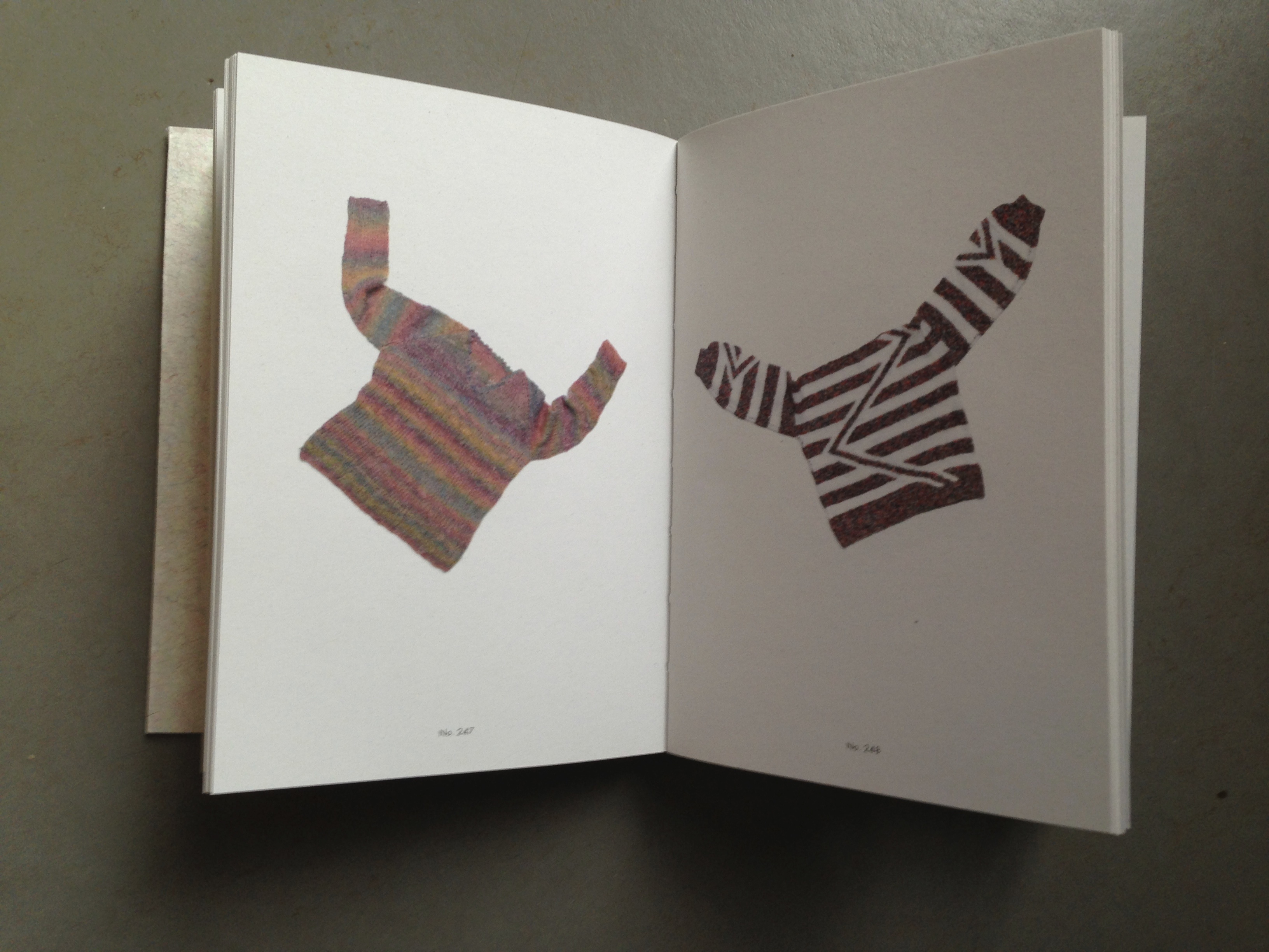 Op elke pagina één trui. Zelfs de negen truien die ze niet kon gebruiken, omdat ze te zeer beschadigd waren, gaf Meindertsma een functie: die werden verwerkt in de omslag van haar boek, dat bestaat uit dik papier met allemaal fliebertjes gekleurde wol erdoor.