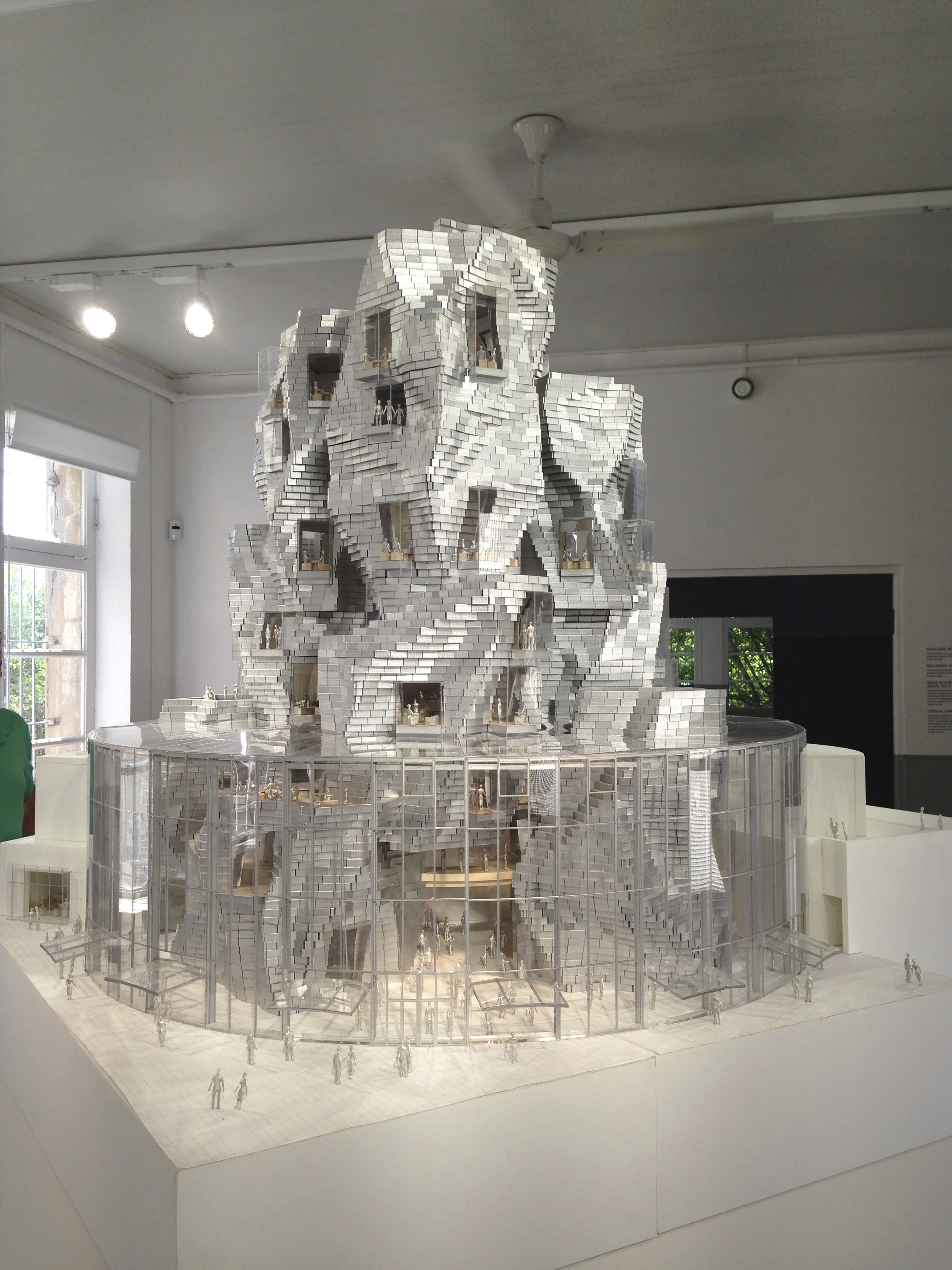 De Zwitserse oprichter Maja Hoffmann vroeg de Amerikaanse architect Frank Gehry, die van het Guggenheim Museum in Bilboa, om een multifunctioneel gebouw te ontwerpen. Een maquette van dat gebouw plus de omgeving, ontworpen door de Belgische landschapsarchitect Bas Smets, staat nu te pronken in een van de ruimten in het Parc des Ateliers. Het is alsof er een glanzende UFO neerdaalde in Arles, waar alles vooral klein en middeleeuws is.