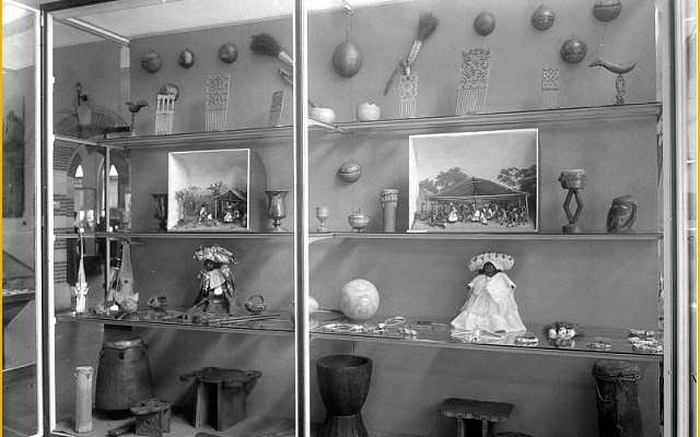 Vitrine met Surinaams Creoolse en Marron objecten in het museum van het Koloniaal Instituut, Amsterdam /