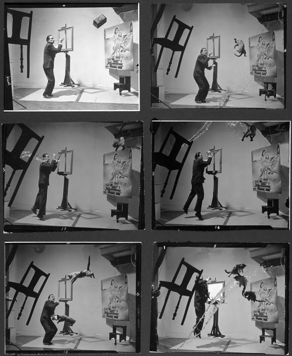 Maar liefst 28 keer hebben vier assistenten van het kunstenaarsduo de drie katten en een emmer water door de lucht gegooid. 28 keer is Dalí omhoog gesprongen. 28 keer stond Halsman klaar om de foto te nemen. Er zijn geen geluidsopnames gemaakt van die sessies, maar je kunt je er iets bij voorstellen. Of zouden die katten na een keer of tien gewend zijn geraakt aan hun nieuwe functie en het gewoon stilletjes over zich heen hebben laten komen? Waren het misschien stuntkatten?