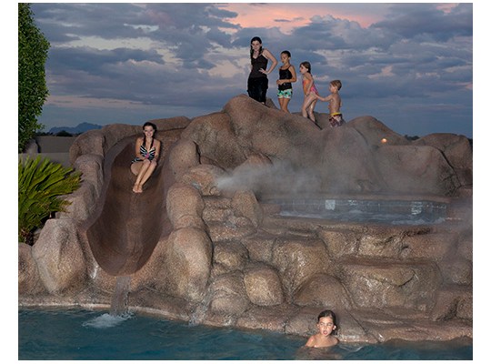 Nou, dan had hij aan Higley een goeie. Daar zien de huizen er prachtig uit, maar ze gemaakt van – Phelps klopt even op het bankje waarop hij zit – geperst hout met een laag verf erover. Het is precies hetzelfde materiaal dat de vader van de fotograaf gebruikte om een speelhuis voor zijn kleinkinderen te bouwen. De rustieke rotsen waarlangs je in het zwembad kunt plonzen zijn gemaakt van kippengaas, styrofoam en ‘rotsverf’, de Griekse beelden in de tuin van plastic. Het oude boerenland verdween en maakte plaats voor rijen en rijen van min of meer dezelfde villa’s met min of meer dezelfde blauwe zwembaden in de tuin.