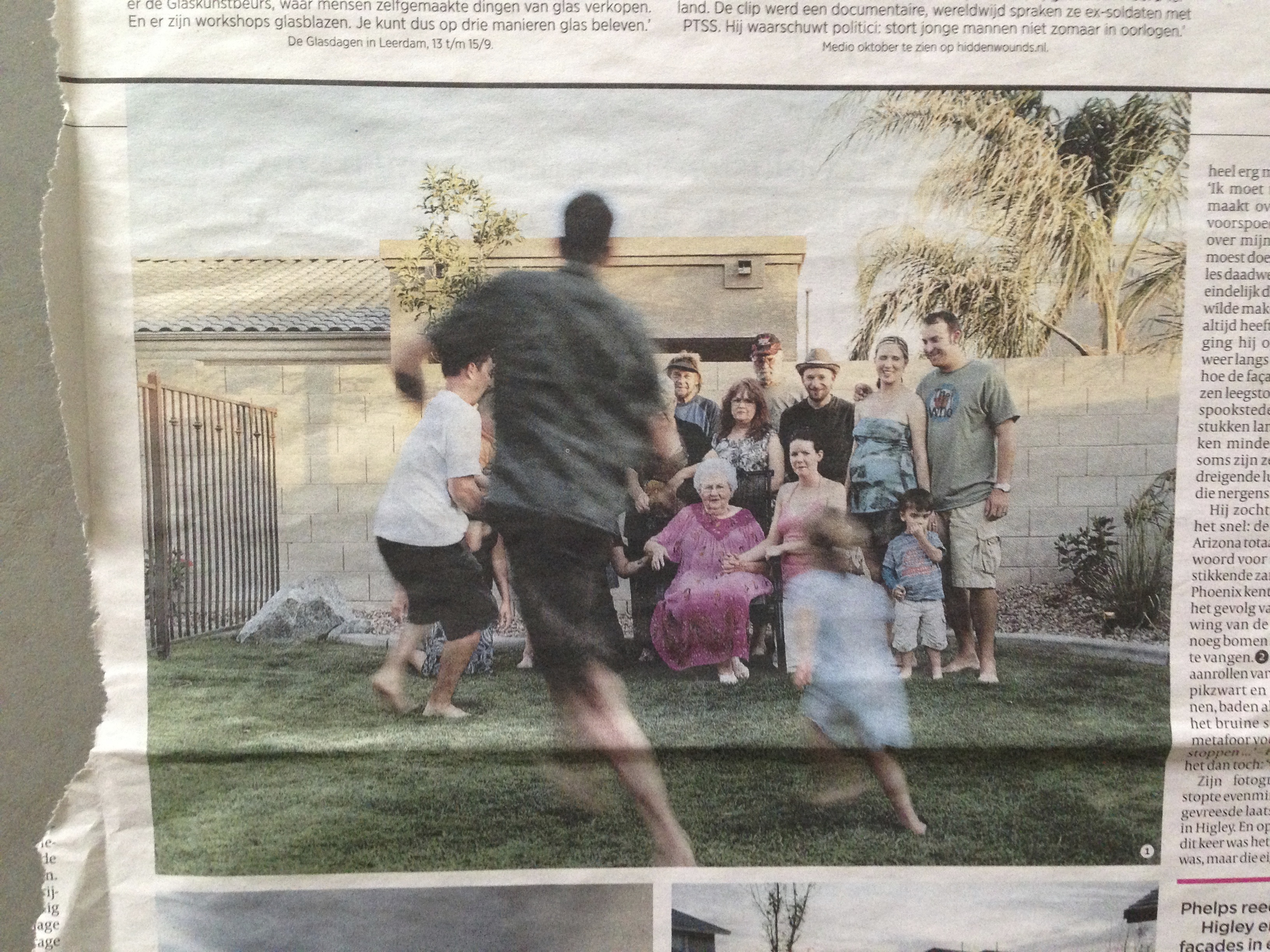 Het was 2007. Het lukte de fotograaf niet om een bevredigend einde te breien aan zijn project Higley, een serie die hij maakte op de plek waar hij zo’n beetje opgroeide, op het platteland vlak buiten Phoenix, Arizona. Maak een familieportret om mee te eindigen, stelde zijn uitgever voor, want een familieportret is een mooie afsluiting van een boek over een familiegeschiedenis. En Andrew Phelps dacht: Prima. Het was zijn laatste dag in Higley, het geld was op en hij besloot gewoon één foto te nemen, één foto van zo’n dure 4×5 film.