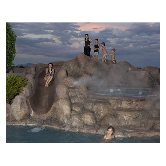 Nou, dan had hij aan Higley een goeie. Daar zien de huizen er prachtig uit, maar ze gemaakt van – Phelps klopt even op het bankje waarop hij zit – geperst hout met een laag verf erover. Het is precies hetzelfde materiaal dat de vader van de fotograaf gebruikte om een speelhuis voor zijn kleinkinderen te bouwen. De rustieke rotsen waarlangs je in het zwembad kunt plonzen zijn gemaakt van kippengaas, styrofoam en ‘rotsverf’, de Griekse beelden in de tuin van plastic. Het oude boerenland verdween en maakte plaats voor rijen en rijen van min of meer dezelfde villa’s met min of meer dezelfde blauwe zwembaden in de tuin.