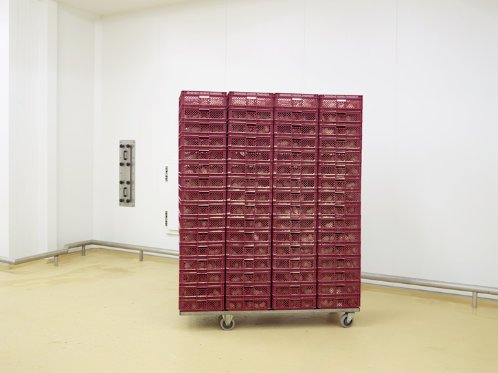 Zo: als een koelbloedige chirurg. Met een heel scherp mesje. ‘Infuus’ staat er bij een foto van paprikaplanten onder UV-licht, die zich dankzij een ingenieus dieet dat via slangetjes wordt toegediend optimaal kunnen ontwikkelen. Bij een foto van een kar met gestapelde rode kratten staat ‘Wachtkamer’, want de kratten zitten volgepropt met pasgeboren kuikens uit de broedmachine die feitelijk niets anders doen dan wachten tot ze worden vervoerd naar een legkippenbedrijf.