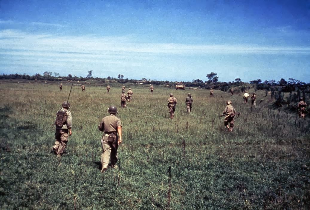 Hier is de ‘oude’ Capa aan het werk: serieus, geëngageerd en met twee voeten stevig middenin het slagveld – maar wel in kleur. Hij legde Franse soldaten vast, terwijl ze onder een strakblauwe hemel door de weidse groene velden liepen of langs de weg keken naar een Vietnamese man met een kind en een troepje ganzen. Hij fotografeerde in een serie de pogingen van een groep mannen om een in de sloot gereden fiets weer op de weg te krijgen. De foto’s van soldaten in het gras zouden nooit gewerkt hebben zwart-wit; de soldaten in hun camouflagepakken zouden compleet verdwenen zijn in het veld, hoeveel grijstinten Capa er ook op had losgelaten.