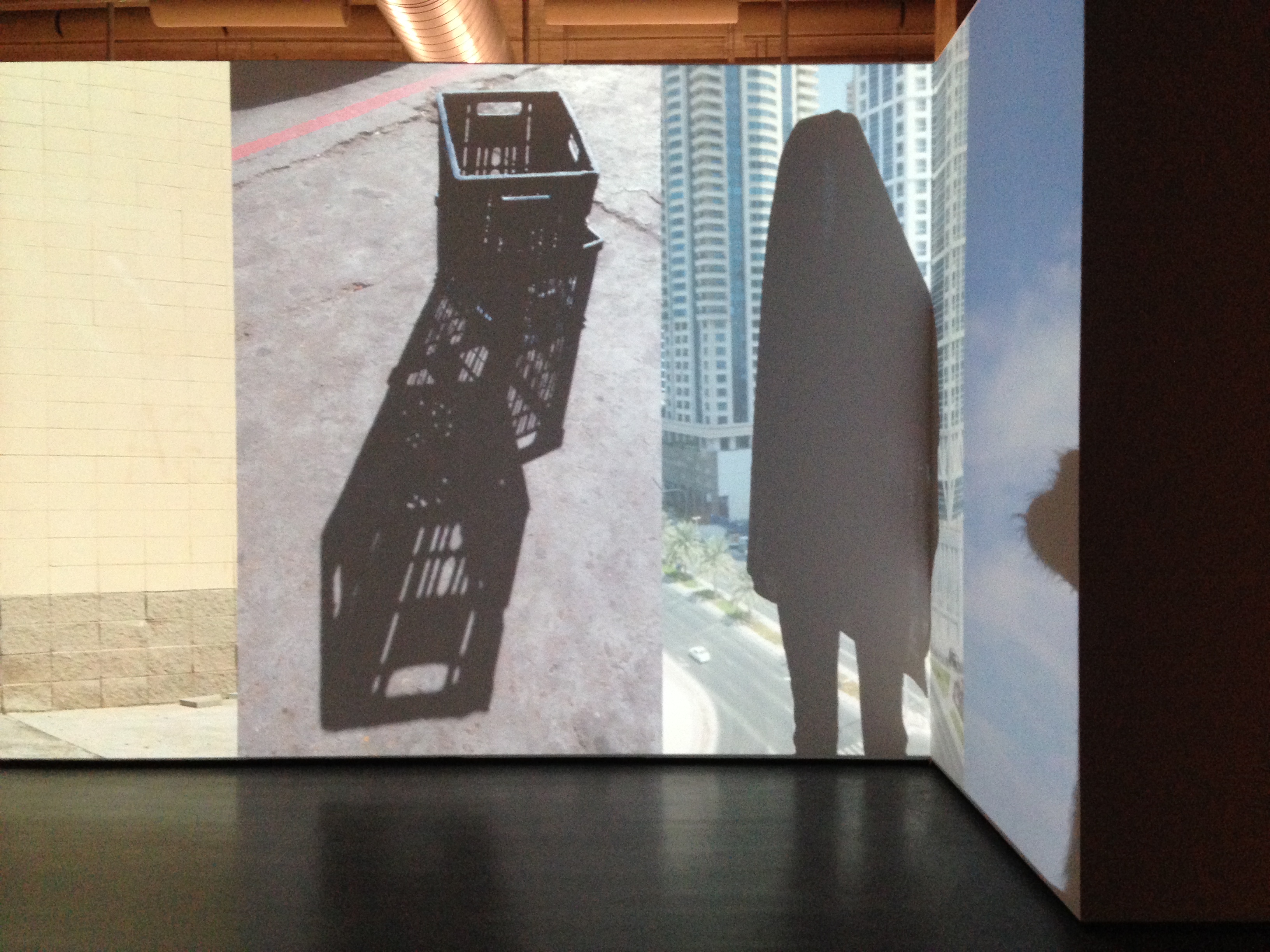 Het begin is spectaculair. Met een spiegelwand en een langzaam voortglijdende projectie van achter elkaar geplakte foto’s over twee muren roept Sassen een hypnotiserende en geheimzinnige wereld op van zwarte silhouetten tegen een lichte achtergrond. De bezoeker speelt zelf een rol in de desolate stads- en woestijnlandschappen – dat wil zeggen: zijn schaduw doet dat. Díe verschijnt in de projectie, díe speelt spelletjes met de zwarte, voorbij schuivende silhouetten. Het is alsof ie zich heeft losgemaakt van zijn eigenaar, die alleen maar kan toekijken zonder werkelijk toegang te hebben tot die schaduwwereld.