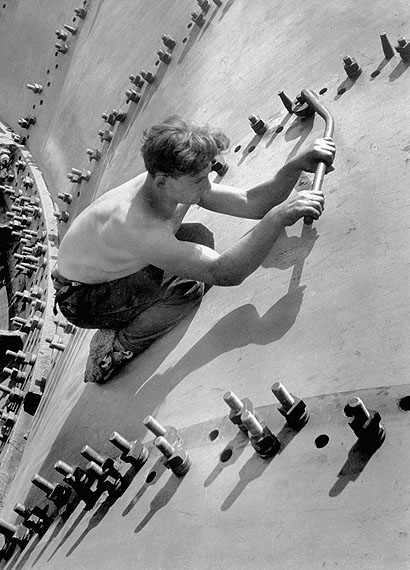 © Margaret Bourke-White, ca 1930: Russische arbeider aan het werk op een turbine in Dnieperstroi, Sovjet-Unie