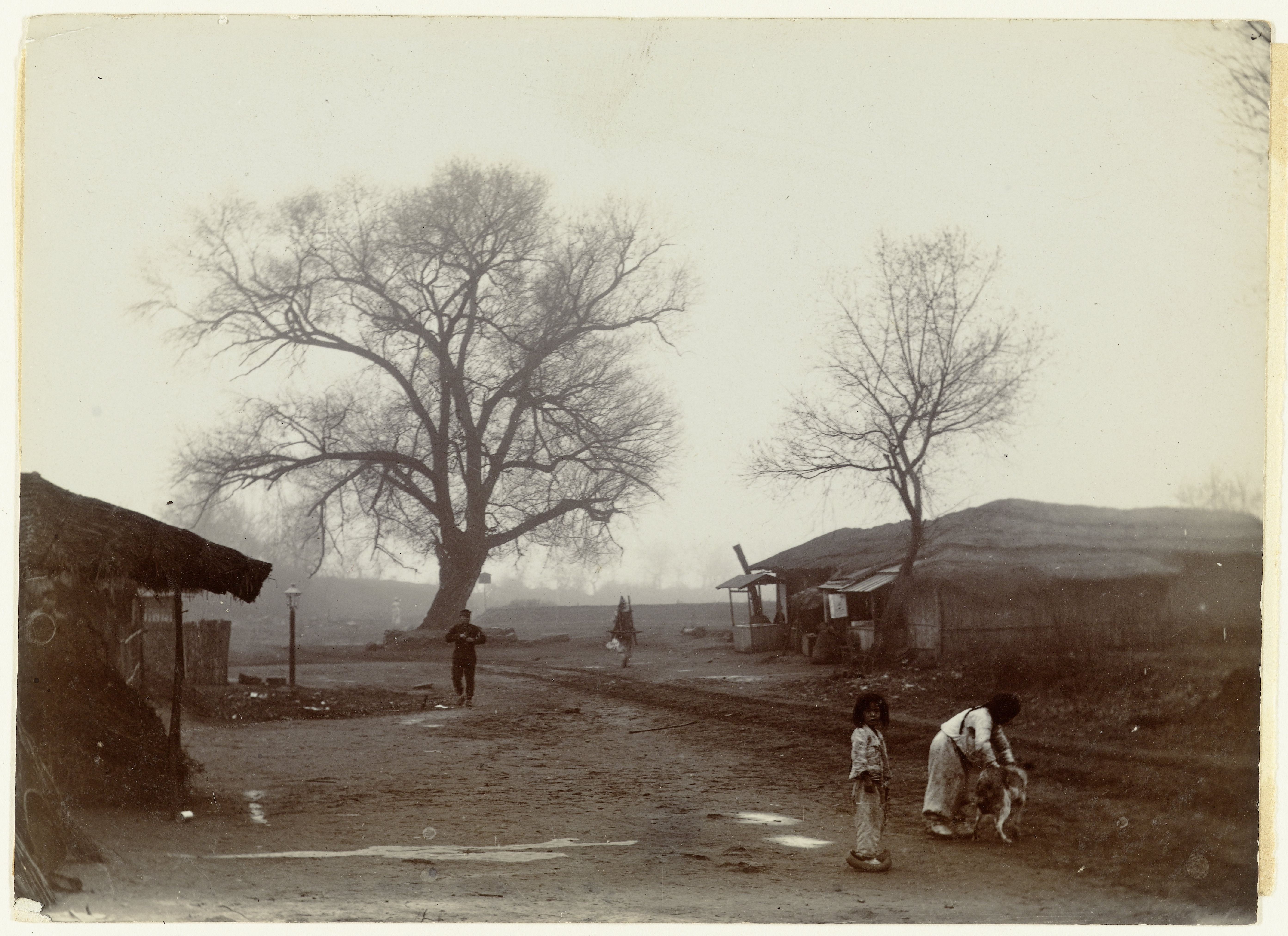 Jan Adriani: Twee kinderen spelen met een hond bij enkele huizen en twee wilgen, Pyongyang, Korea, 1907. Collectie Rijkmuseum
