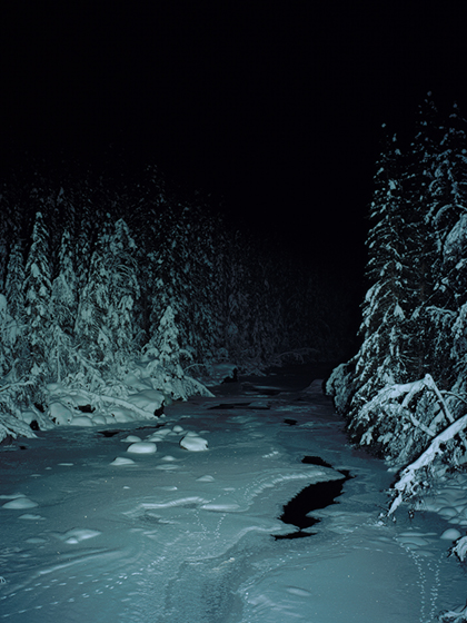 Het is daar dat de tentoonstelling volledig bezit van je neemt. Alsof je zit opgesloten in één van Goiris’ fotoboeken en zowel gedwongen als gefascineerd staart naar groen en blauw oplichtende sneeuwlandschappen, waarin mensen in witte pakken onbestemde dingen doen en het verlaten landschap oogt als na een buitenaardse aanval.
