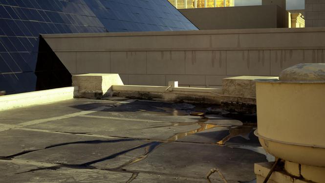 Dat deed Marie-José Jongerius. In 2004 fotografeerde ze vanuit een hotelraam in Las Vegas wat zich voor haar ogen uitstrekte. Geen ‘echt’ landschap, maar een geconstrueerd geheel van daken, schuin en plat, een stukje bewolkte hemel en achteraan een deel van het glinsterende Mandalay Bay Hotel, dat obsceen grote, spiegelende gebouw dat iedereen wel kent van ansichtkaarten en reclamefoto’s, waarop de lucht altijd strakblauw is en de palmbomen fier rechtop staan. Op haar foto weerspiegelt het gouden hotel in de stroompjes regenwater op het platte dak op de voorgrond.