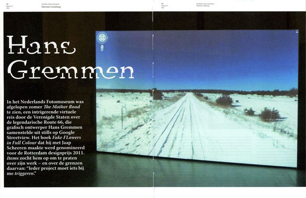 Een computer en een stoel – in 2012 was dat alles wat vormgever Hans Gremmen nodig had voor een reis door de Verenigde Staten. Oja: een kop koffie af en toe. Met behulp van Google Streetview legde hij zo’n 3800 kilometer af, van Chicago tot Los Angeles, langs Route 66. Stap voor stap, motel voor motel. ‘Wat is het verschil tussen mijn reis en die van iemand die dezelfde route volgde en het landschap zag vanuit een auto met airconditioning en getint glas?’, vraagt Gremmen zich af. ‘Een plek bestaat niet alleen als een punt op de kaart, maar is ook het product van verhalen, films en foto’s.’