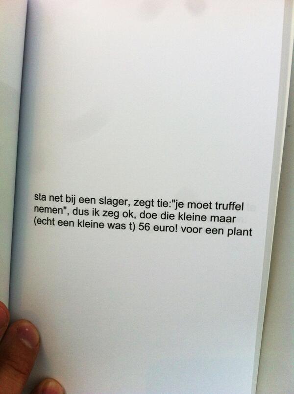 Van gepaste trots naar schaamtevolle verbazing naar langzaam indalend besef: dit is globaal de reactie, wanneer mensen worden geconfronteerd met hun persoonlijke Tweetbundel, samengesteld door fotograaf Jan Dirk van der Burg. Het is ook niet niets natuurlijk. Heb je jarenlang dagelijks van die ultrakorte berichtjes de wereld ingestuurd, soms overdacht, soms impulsief of in een dronken bui, maar altijd met het idee dat je zo goed bent als je laatste, briljante en dolkomische, tweet en dat die ene pijnlijke van twee jaar geleden godzijdank verdween in de verrukkelijke vluchtigheid van het medium – komt iemand op het idee te gaan graven in jouw digitale prehistorie en de ‘beste’ uitspraken en ongemakkelijke selfies in een boek op te nemen.