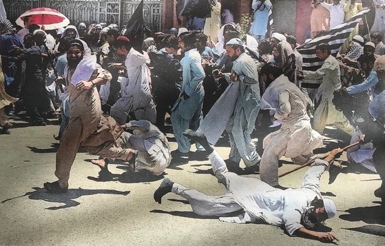Ook fotografie is goed in het vangen van die absurde gelijktijdigheid, van dingen die op hetzelfde moment gebeuren en daardoor een samenhang lijken te hebben. Deze foto van de Pakistaanse fotojournalist Abdul Majeed is een mooi voorbeeld. De fotograaf was in Peshawar, in het grensgebied tussen Pakistan en Afghanistan, toen op 27 mei aanhangers van de conservatieve Jamiat Ulema-e Islam-partij slaags raakten met de politie. Ze waren de straat op gegaan om te protesteren tegen een historische hervorming: een nieuwe wet die bepaalt dat de autonome stamgebieden in het noorden van Pakistan volwaardig onderdeel zijn van de Pakistaanse staat, om te voorkomen dat die gebieden als uitvalsbasis kunnen dienen voor extremistische groeperingen.