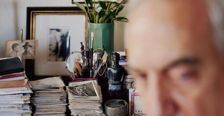 Daar zit Helprin, een statige vrouw met grijze krullen in een groen gewaad, in een bohemien interieur met veel hout en hangplanten en Perzische tapijten. Ze kijkt recht en rustig in de camera. Soth fotografeerde haar vanuit de tuin, door het raam heen; een boom weerspiegelt in het glas. ‘Het ziet er misschien afstandelijk uit,’ zegt hij, ‘maar het voelde zó anders na die vijftien één-op-één-sessies. Veel aandachtiger. En ik dacht: O! Ik kan weer terugkeren naar het fotograferen van mensen, maar nu minder van ze verwachten. Ik hoef ze niet langer te manipuleren, er hoeft geen formule te zijn, ik hoef me ook niet schuldig te voelen achteraf. Ik ben vrijer.’