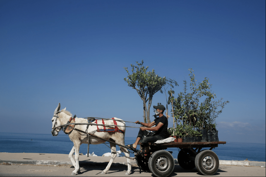 De foto werd gemaakt in de Gazastrook, een explosieve regio – maar is hier iets van geweld te zien? Gelukkig niet. Gaan we door. De Palestijnse man op de bok draagt een mondkapje. Mooi, dan krijgen we daar geen gezanik mee. Hij stoot ook geen surplus aan CO2 uit, want het ontbreekt de kar waarmee hij zijn planten vervoert aan een verbrandingsmotor. In plaats daarvan die ezel, een witte nog wel, behorend tot de leukste en slimste beesten ter wereld.