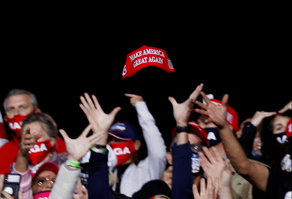Op 19 september, tijdens een Republikeins campagne-evenement in North Carolina, werd dit rode MAGA-petje richting het publiek gegooid. Men probeerde het te pakken, maar de fotograaf was degene die het ving. Nu hangt het, haarscherp, voor eeuwig tegen die gitzwarte achtergrond, die Brenner ongetwijfeld donkerder maakte dan-ie was, voor het effect.