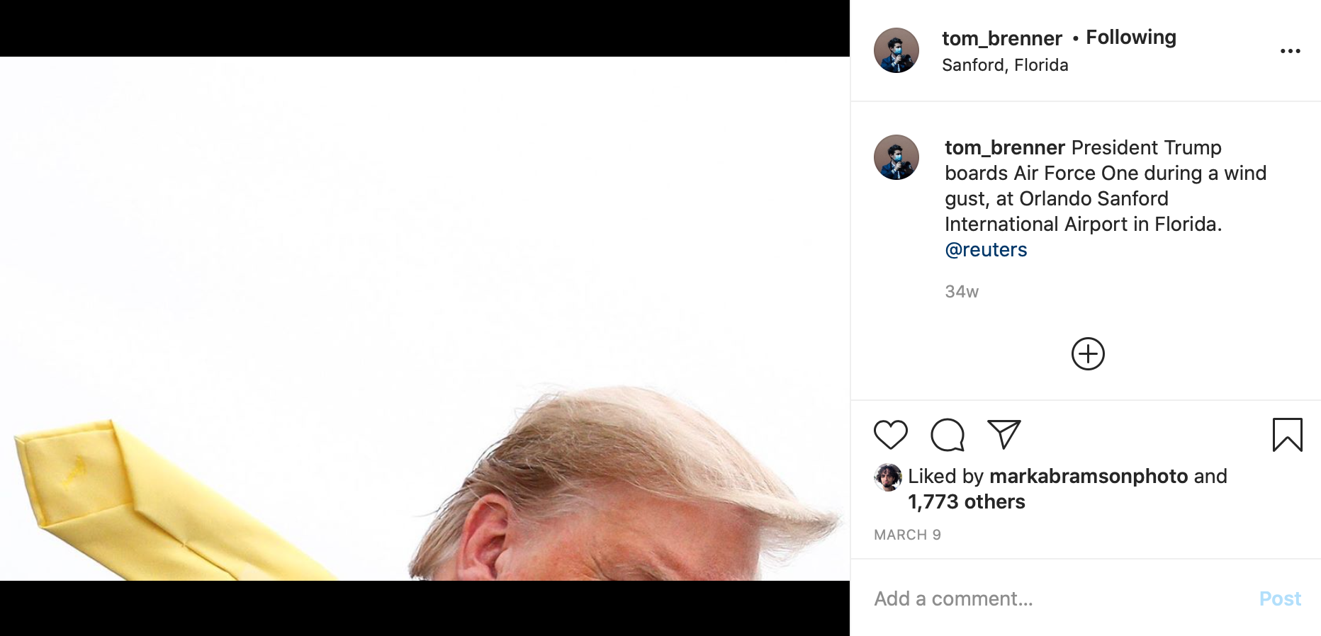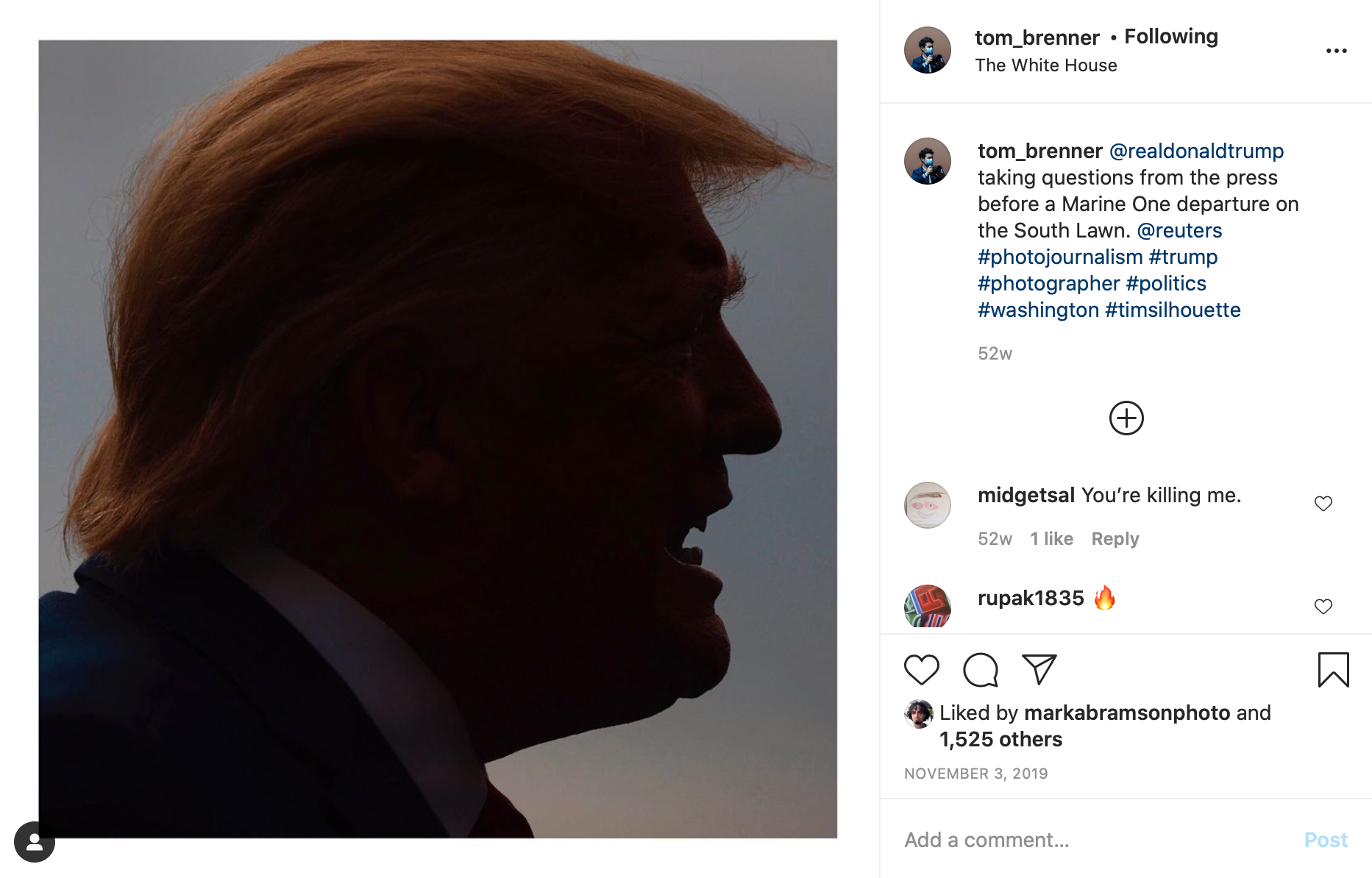 Tom Brenner is een ongelooflijke fotograaf, laat ik daarmee beginnen. Hij is een fotojournalist die de Amerikaanse politiek in beeld brengt voor persbureau Reuters. De laatste tijd concentreert hij zich vooral op de president en zijn directe omgeving. Nu zal dat zeker niet voor iedereen gelden, maar wat mij betreft is dat een ondankbaar onderwerp. Beeldmateriaal van Trump c.s. ga ik uit zelfbescherming uit de weg, voor zover dat mogelijk is.