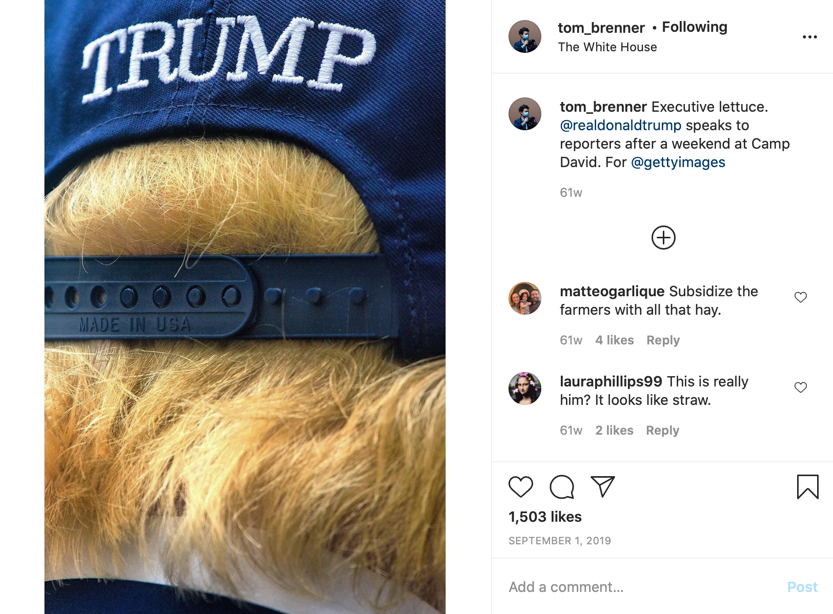 Zo omschreven klinkt het alsof Brenner de president steeds voor aap zet. Dat is niet zo. Ook anderen onderwerpt hij aan zijn bijzondere manier van kijken en kadreren; ook Bernie Sanders werd door hem eens in tweeën gehakt. Afgaande op de commentaren op bijvoorbeeld Instagram vallen Brenners foto’s van Trump in de smaak bij zowel de mensen die een afkeer koesteren voor de man als bij hen die gaan voor ‘four more years’. Beide groepen zien erin wat ze willen zien.