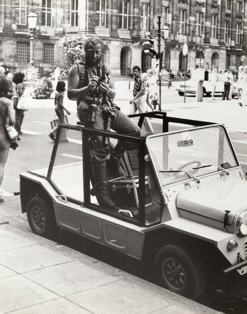 Er bestaat een foto van Ed van der Elsken uit 1977 (gemaakt door Fred Vijver), waarop hij eruitziet als een kruising tussen een Hollywood-oorlogsheld en de Griekse god Poseidon. De fotograaf – volle baard, zongebruind – is op die foto rond de vijftig. Hij staat in zijn Austin ‘Mini Moke’, de open stadsjeep waarmee hij in 1983 ’s ochtends vroeg door de straten van zomers Amsterdam zou rijden om het beroemde intro van zijn film My Amsterdam op te nemen. Hij heeft de auto voor het Paleis op de Dam geparkeerd. Het is warm, zijn armen zijn bloot en imposant. Onder zijn borstelwenkbrauwen is de blik schalks, licht spottend. Er hangen drie camera’s om zijn nek, het toestel met de langste lens bungelt suggestief tussen zijn benen.