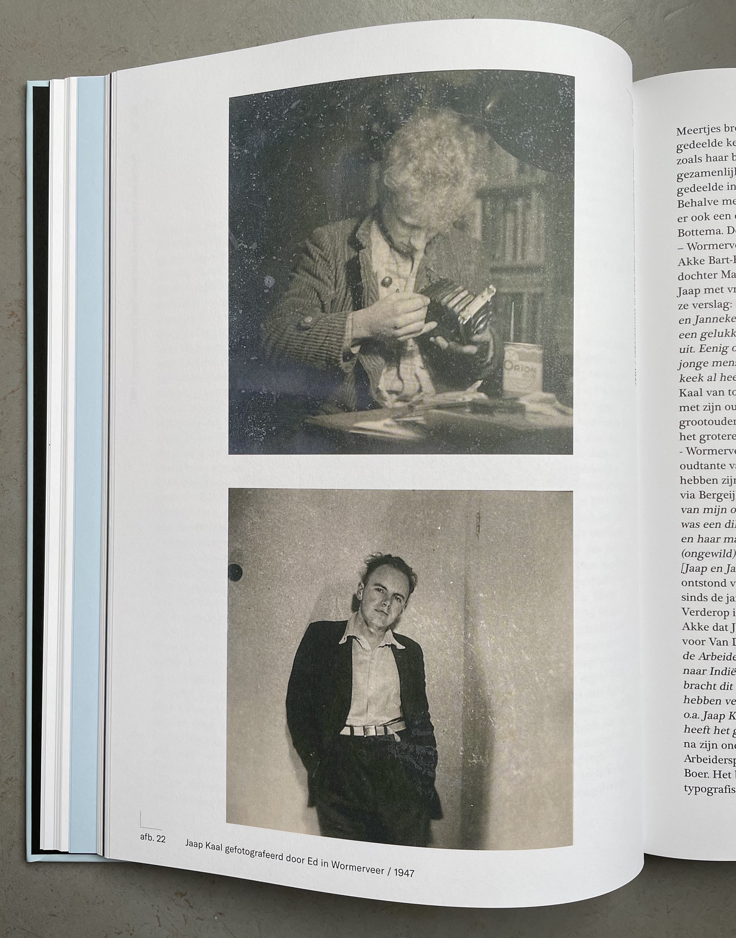 Ook uit die tijd bestaat een foto. Hij staat in dit boek, dat de titel Early Ed meekreeg en gaat over de jaren des onderscheids van Ed van der Elsken. Met andere woorden: de periode voordat Ed van der Elsken ‘Ed van der Elsken’ werd. Het is een portret van de fotograaf als jonge twintiger, twee jaar na het einde van de Tweede Wereldoorlog gemaakt door zijn vriend Jaap Kaal in Wormerveer. Van der Elsken, destijds student aan de Nederlandse Fotovakschool in Den Haag, zit aan tafel, gekleed in een corduroy jasje (dat, zo las ik, leuk detail, oranje was). Hij morrelt in opperste concentratie aan een camera – waarschijnlijk de oude 9 x 12 platencamera van zijn vader – en lijkt zich niet bewust van Kaal. Op zijn hoofd een bos blonde krullen als eierdons.